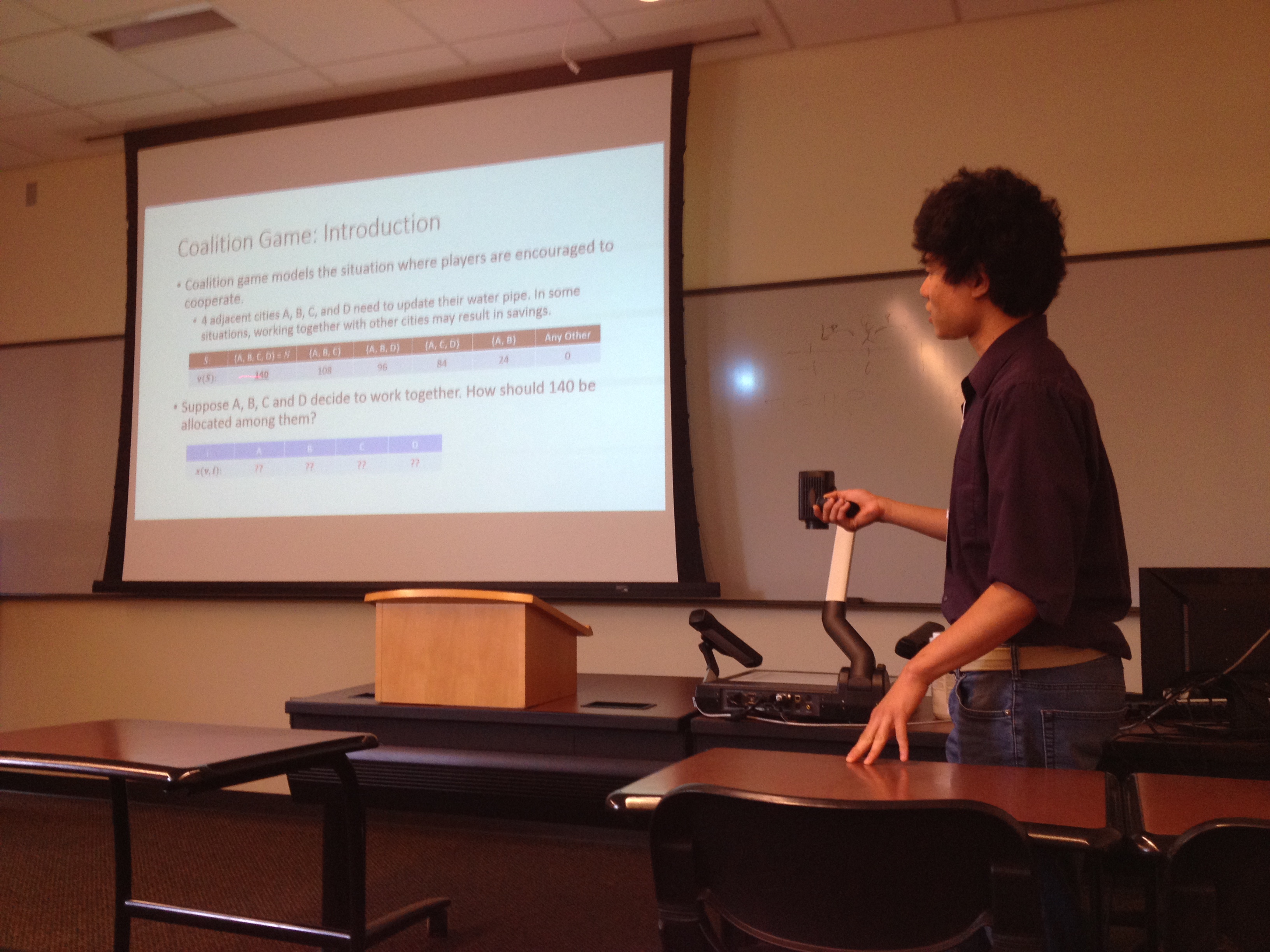 Matt explored when a method for allocating benefits from a collaboration satisfies a desirable fairness property. A coalition game (N, v) models a situation in which gains can be made by collaboration: N = {1, 2, . . . , n} is the set of players and v(S) is the real-number gain achievable for each nonempty subset S of players (called coalitions). The question is how to fairly allocate the gains obtained through collaboration, that is, what payoffs x1, x2, . . . , xn should be given to the players subject to the constraint x1 + x2 + … + xn = v(N)? The nucleolus is an allocation method that is group rational: the sum of the payoffs given to the players in S is at least v(S) for all coalitions S whenever such an allocation exists. Unfortunately, the nucleolus is not always group monotone: an increase in one of the coalition gains v(S) may result in a decrease in the nucleolus allocation for some player in S. Matt started to characterize the 4-player coalition games at which the nucleolus is group monotone.