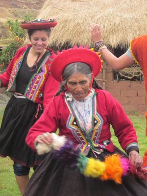 We feasted on roasted corn kernels, boiled potatoes, beef and chicken skewers and all the mate (herbal tea) we could drink. In the morning Nati’s mother met us at the door of the lodge and showed us her wares. Grandma raises the sheep, sheers the wool, dyes it with natural colors, spins the yarn and weaves beautiful belts and table runners. And she dances too…