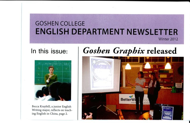 English Writing major reflects on teaching English in China, Goshen Graphix release party reviewed, Peter Fallon visit and much more....