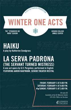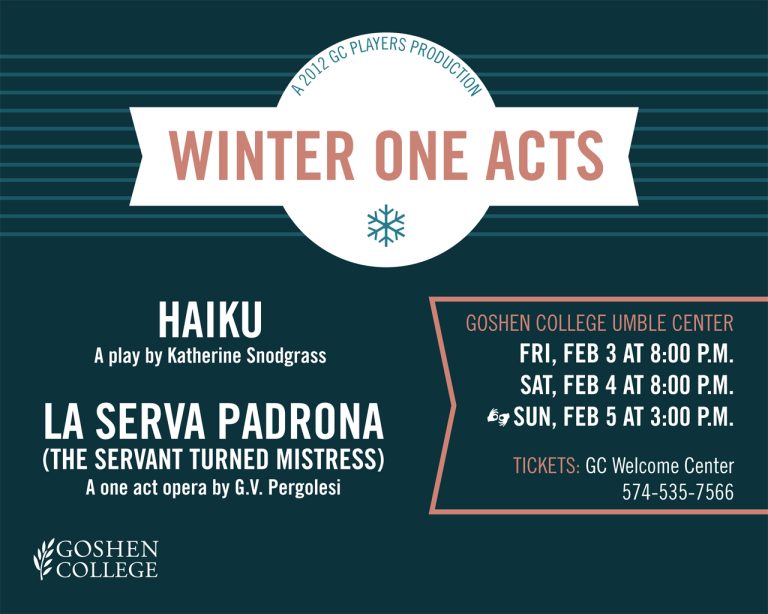 GOSHEN, Ind. – Goshen College’s 2012 Winter One Acts will feature a playful opera and a modern drama, each about the misconceptions of identity, directed by two December 2011 graduates. The Goshen College Players will present “Haiku,” by Katherine Snodgrass...