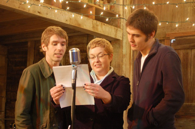 Tristan Beechy-King, Sara Wakefield and Phil Weaver-Stoesz read a collaborative piece at Art in the Barn