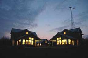 A windmill spins in the breeze atop its hundred-foot tower; glycol oozes through pipes underground on its journey to and from ground source heat pump units; downspouts funnel water into a cistern for later use flushing toilets.