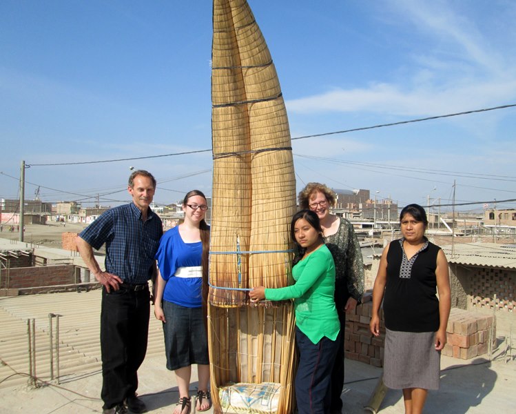 In the afternoon, we began our visits to each host family home, starting with Jessica in the city of Santa Rosa, an hour’s run down the beach from Pimentel. Jessica’s sister, Jhomira, 18, is a student at Harvest. We shared a meal of aji de gallina with Jhomira and her parents, Juan Carlos and Gloria, and her brother Benjamin, 15. A fisherman, Juan Carlos led us up to the roof, where he stores a narrow, reed boat, called a caballito de totora, or “little horse,” made of the totora reed. It’s the traditional fishing boat for this region.