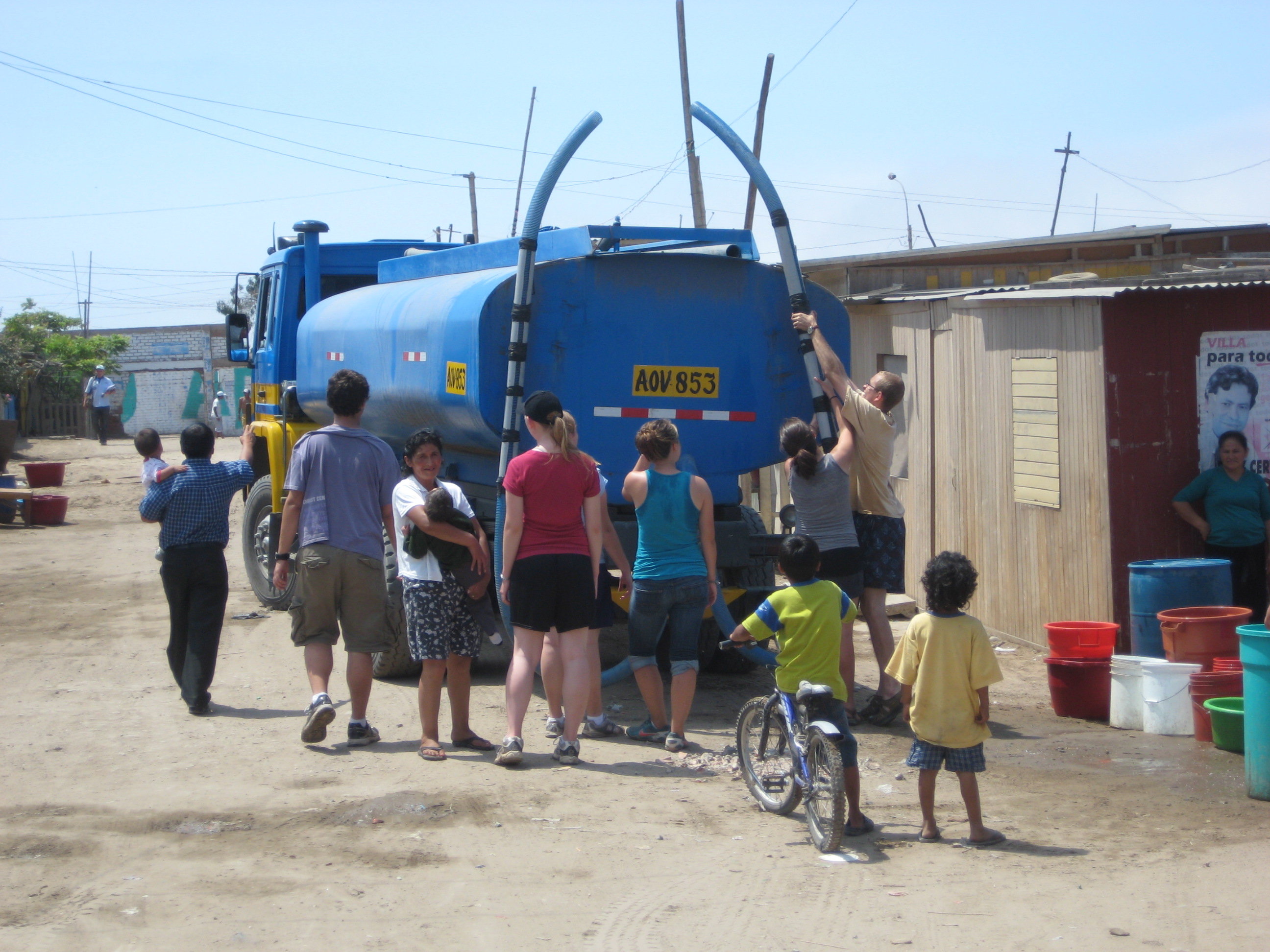 Corpusa and her neighbors—who are fortunate to be on relatively flat ground–wait for trucks to deliver water to the large barrels outside each home. At a cost of 1.5-2 soles per barrel (between 50-75 cents) the water they buy is typically more expensive than what’s available to Limeños with regular water service. For $97 we were able to hire three water trucks to come with us, and the SSTers spent the morning refilling many empty barrels (and getting pretty wet in the process).