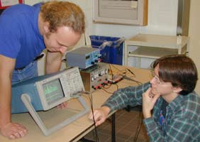 Matt (right) ponders the chaotic output on the oscilloscope while Matt (left) looks on.
