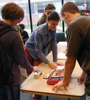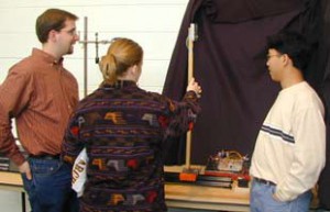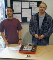 Student projects in the Physics department’s Electronics course were all on display in a grand show Dec 7, 2001. Over 100 visitors came to see the clever gadgetry on display.