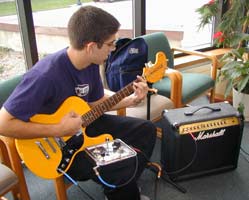 Luke plays his electric guitar through his distortion box (resting on his knee).