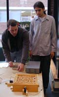 Matt (right) watches while Biology professor tries to guide the ball through the labyrinth (foreground) by remote control.