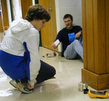 Eric (right) is about to block the laser beam so the WAD will send a special signal on the FM transmitter.