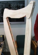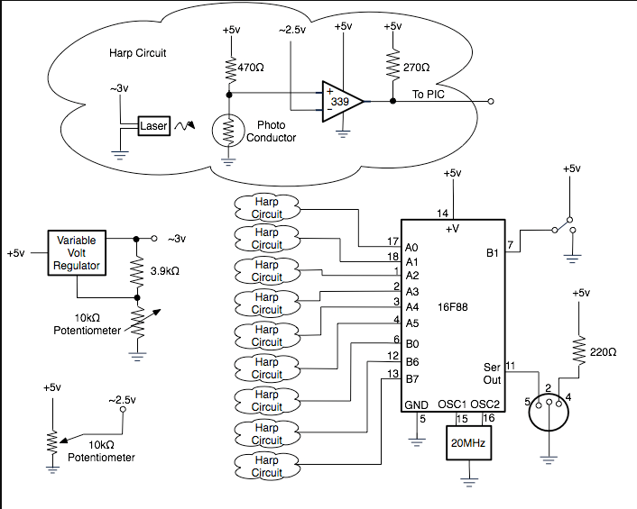 Notes are played by “plucking” laser beams instead of strings. The laser beams are hitting photo conductors whose resistance changes depending on how much light is hitting them. This change in resistance then gets translated into a digital “on” or “off” signal that is read by the microcontroller. The microcontroller then outputs a signal that can be read by almost all electronic musical instruments. This signal uses MIDI (Musical Instrument Digital Interface) which is standard for reading and sending electronic musical signals.