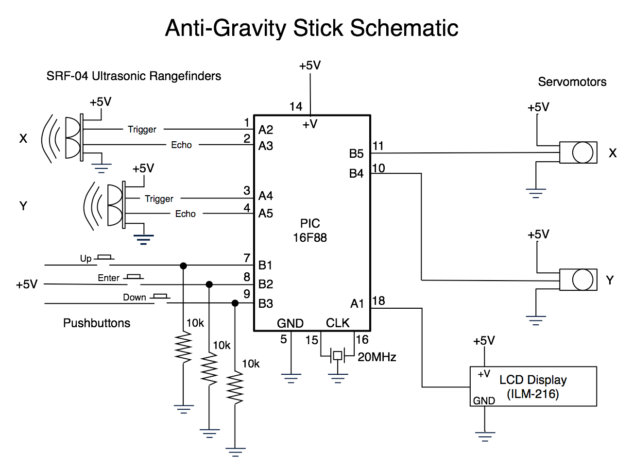 The Anti-Gravity Stick circuit and apparatus keep an ordinary broomstick upright by adjusting the position of its base. The position of the top of the stick is measured using ultrasonic rangefinders, and the microcontroller uses this information to control the servomotors which move the platform. The project succeeded in balancing the stick in two dimensions for minutes on end.