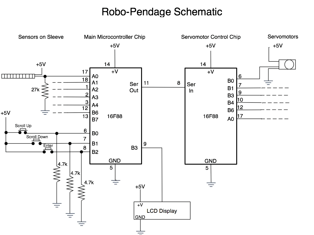 Robo-Pendage is a servomotor-controlled robotic arm that is designed to roughly reproduce the motions of a human arm through a sleeve worn by the operator. Flex sensors, which change resistance based on the degree to which they are bent, are mounted on the sleeve and supply data on the position of the arm and hand to the main microcontroller chip. The main chip then processes this data independently of timing constraints required by the servomotors on the robotic arm. The servomotor positions are then sent from the main chip to the servomotor control chip, which drives the servomotors used to position the robotic arm.