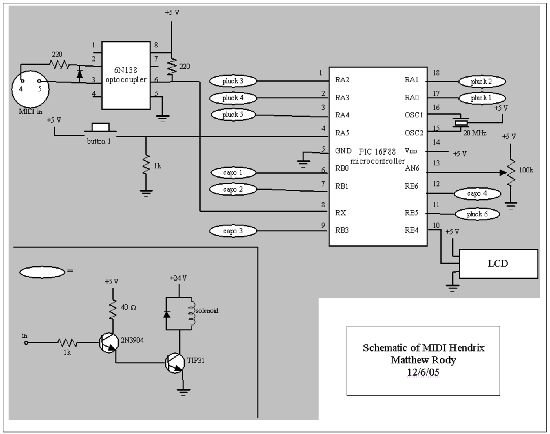 MIDI (musical instrument digital interface) is the language that electronic musical devices use to communicate with each other. Messages are sent through a single wire in the form of three bytes of information: the status byte, which says to turn a note on or off, and two data bytes, the first saying what note to play and the second saying how loudly to play that note. The Microprocessor of MIDI Hendrix receives MIDI messages from an electric keyboard or some other MIDI device and interprets them. Then it sends out signals to 10 different solenoids, four of which control “capos” and six of which control “pluckers.” The solenoids then move back and forth to capo or pluck a string in a way to play the note that was sent to the microprocessor. Rock on.