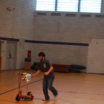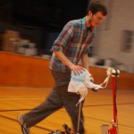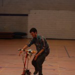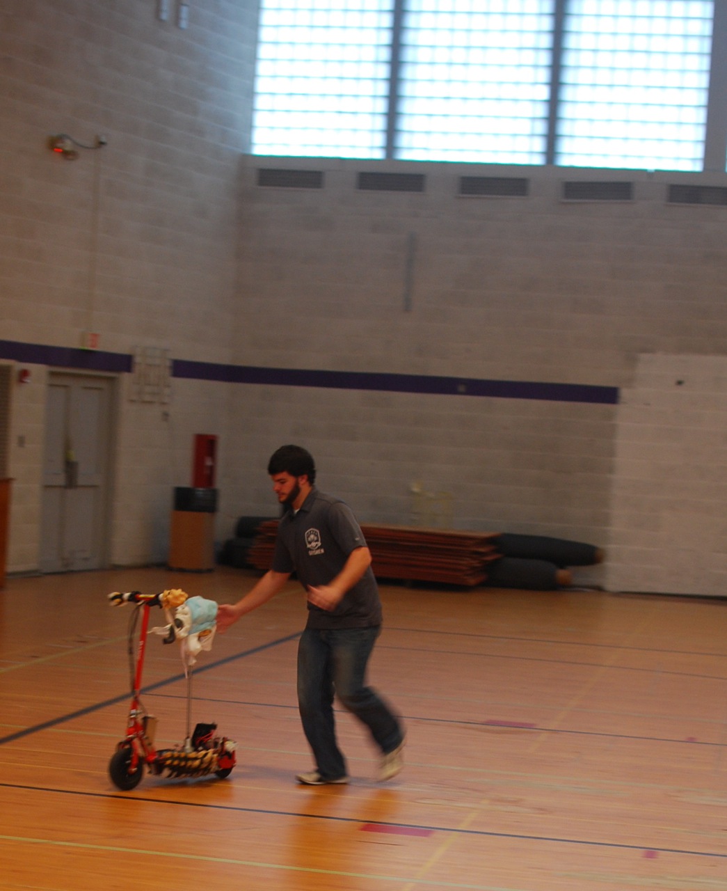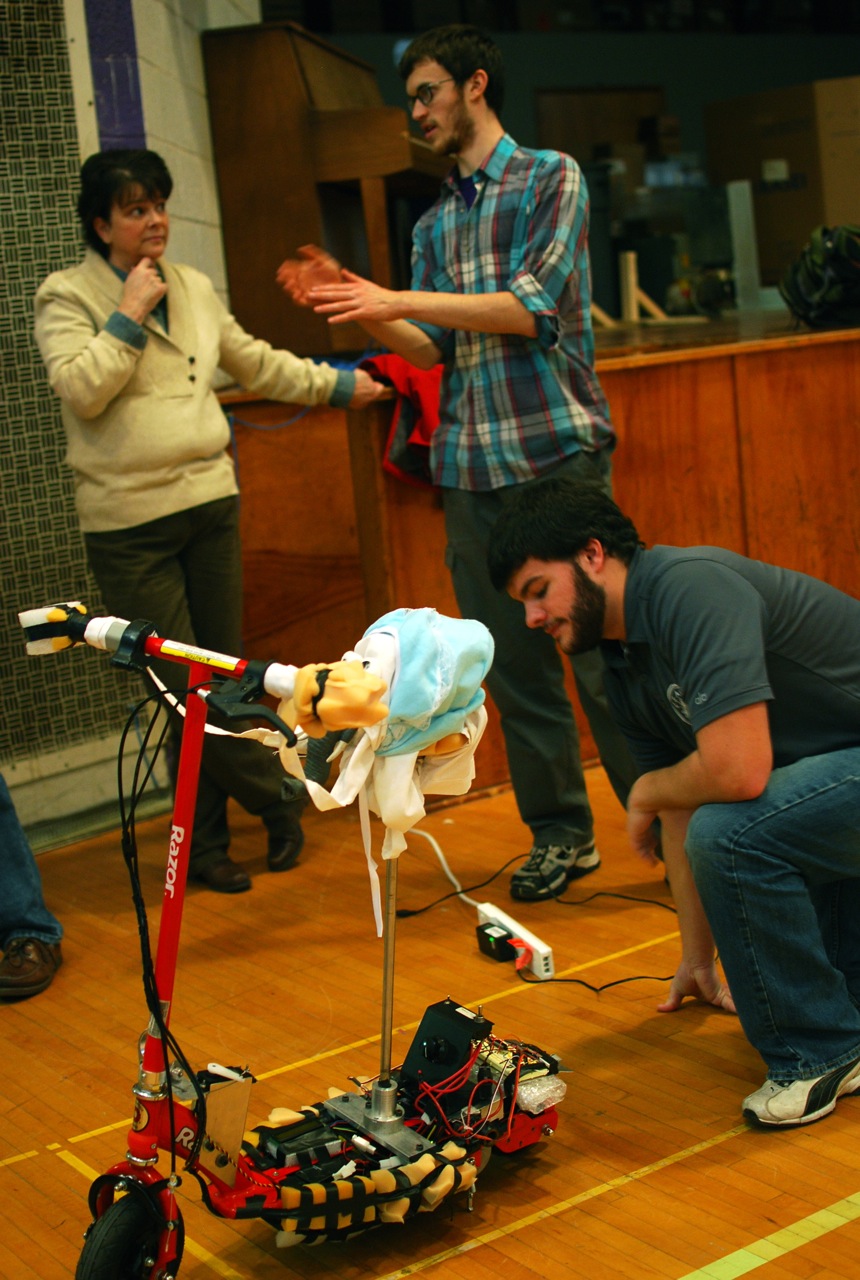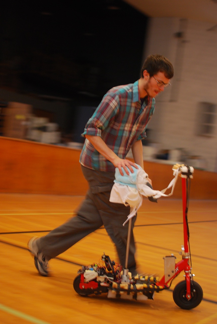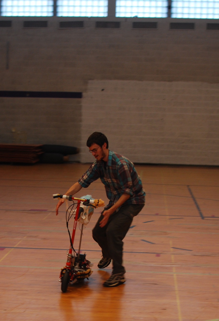 Michael and Aaron took an electric scooter, added a force sensor (to detect tilt) and a circuit that turned the steering column in response to tilt. Their scooter balanced itself as it moved across the gym.