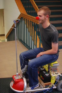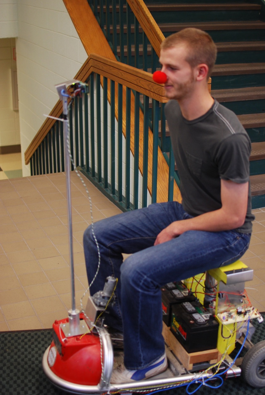 A video camera mounted on the steering handle of an electric cart detected the position of the driver’s red clown nose. Depending on the position, the cart turned left or right, sped up or slowed down: Hands-free operation!