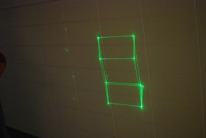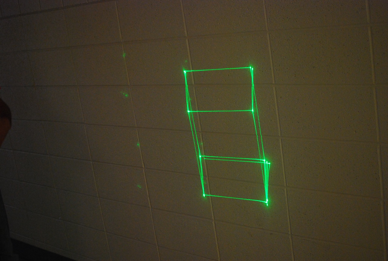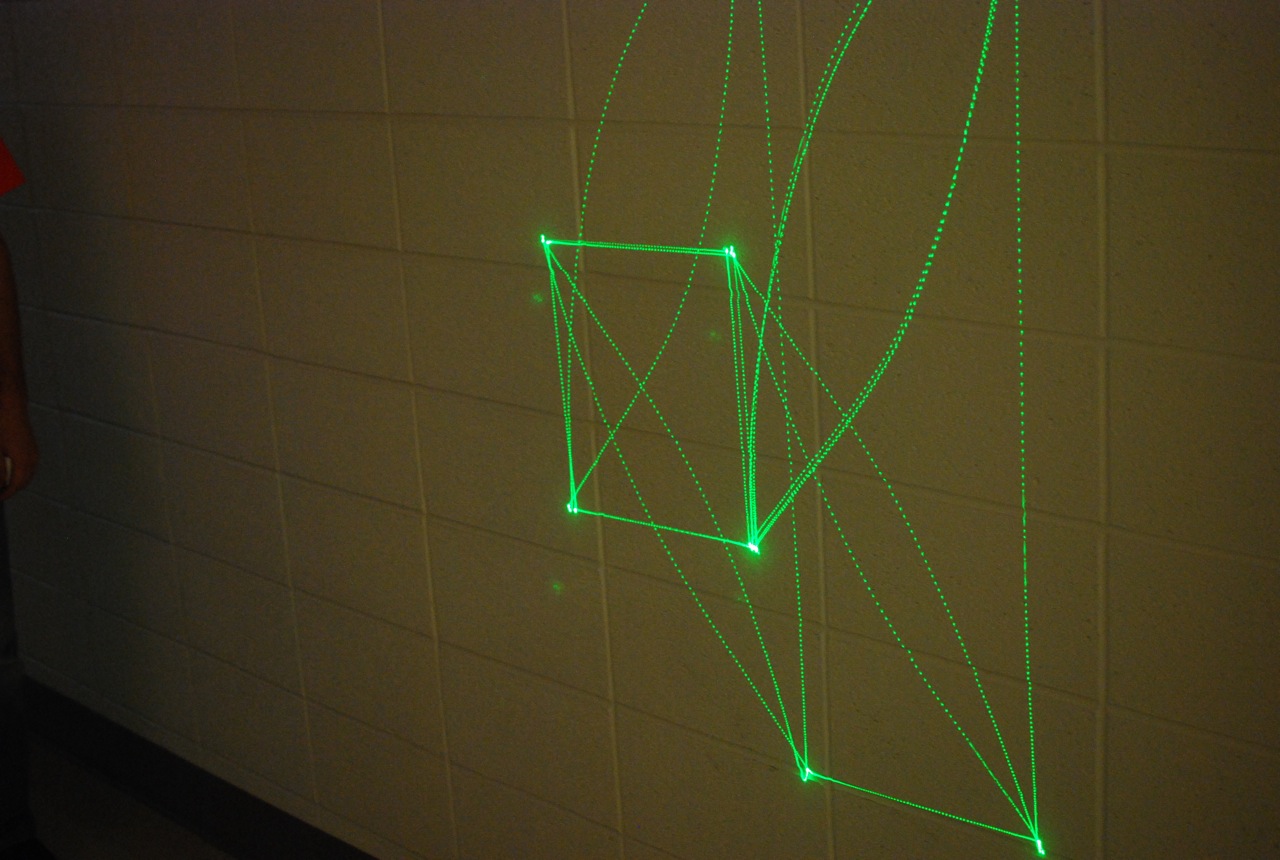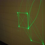 A laser drew a pattern on the wall which could be manipulated by an operator. The positions of the operator’s hands in two lightboxes were sensed, and the pattern was edited and manipulated accordingly.