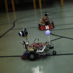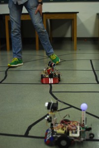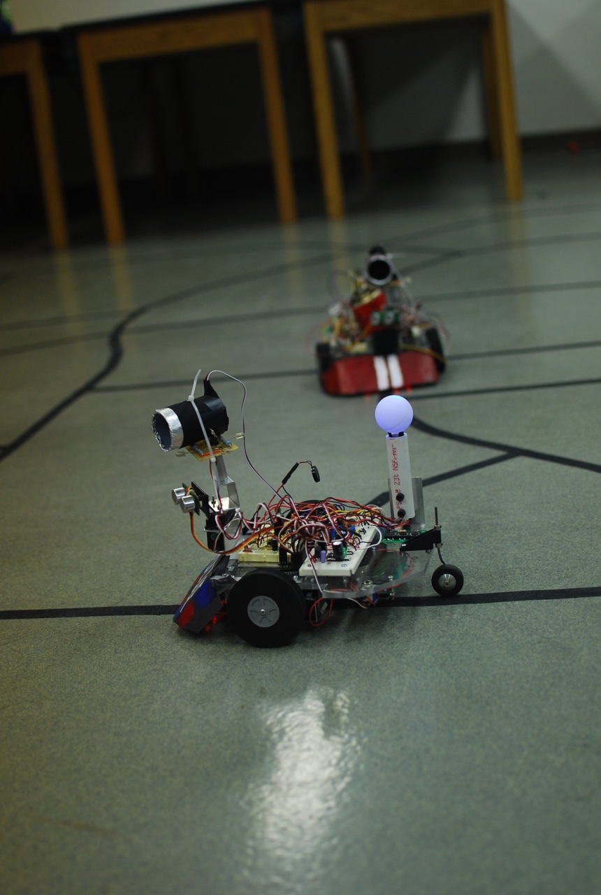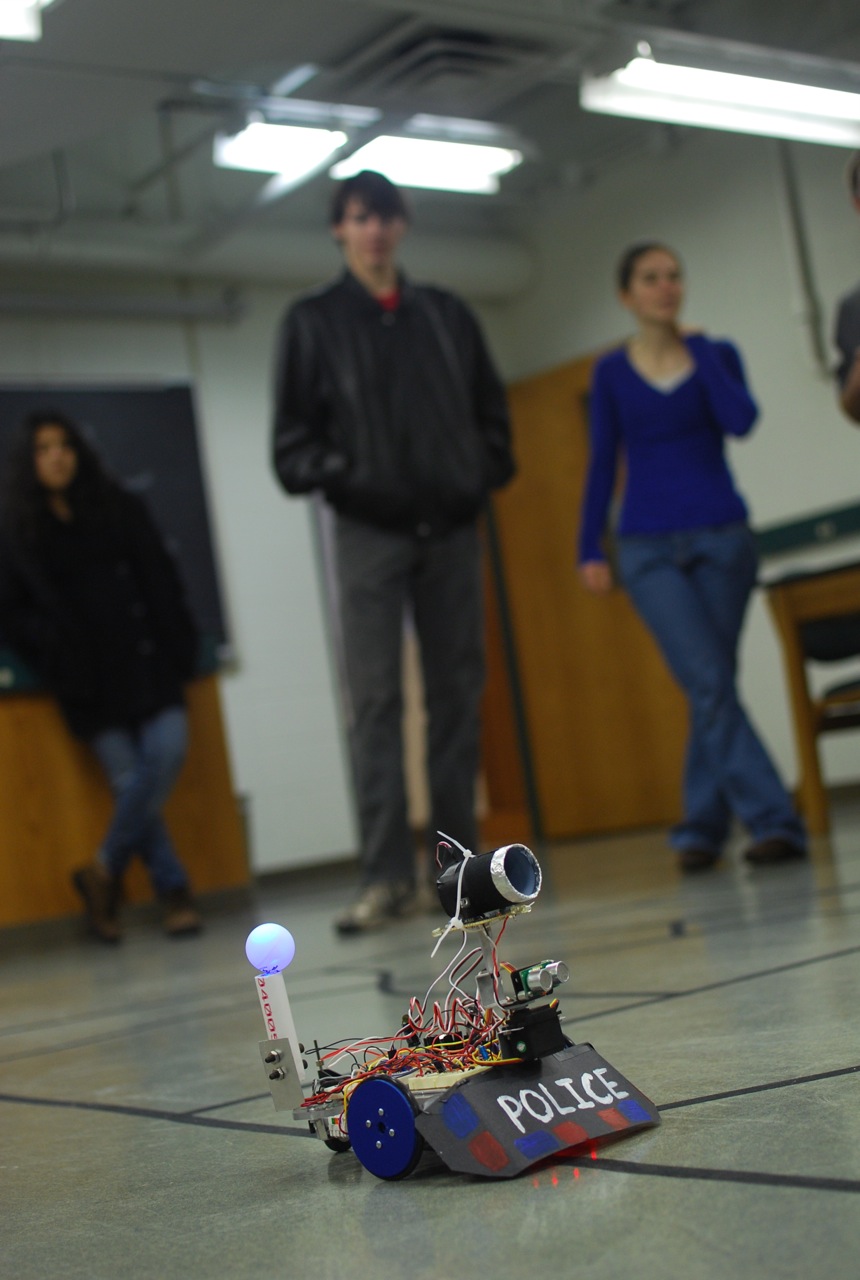 This project involved constructing 4 autonomous robots: 3 cops and 1 robber. All the robots were programmed to move only along the lines of a maze of black tape on the floor: each robot detected the reflection or lack of light reflection if the black tape was immediately below it, and steered accordingly. Each robot was fitted with an infrared LED and infrared detectors so that they could detect each other. The robber was programmed to move across the maze away from the cops, who were in turn trying to run down the robber.