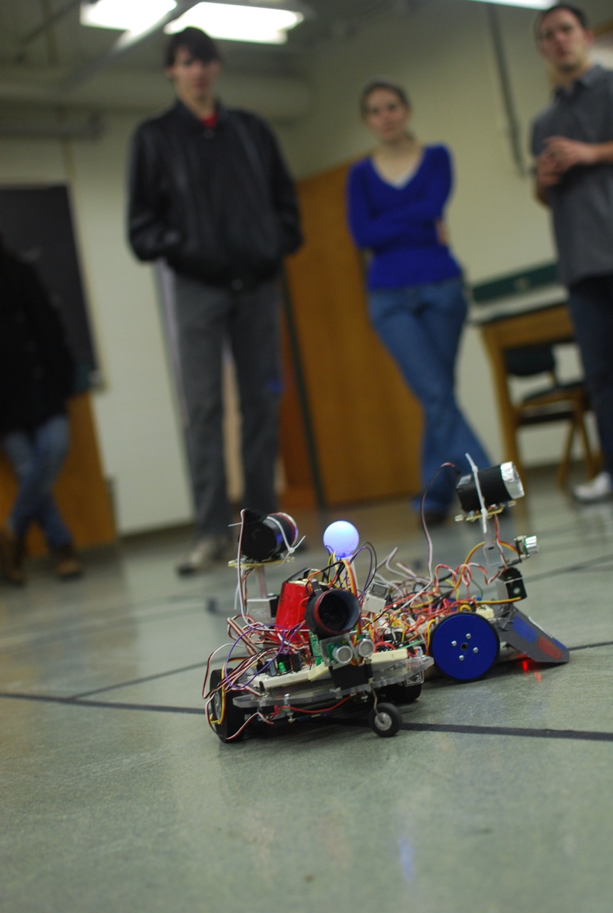Hall monitor was a robot with IR sensors programmed to run down a long hallway and avoid the walls.