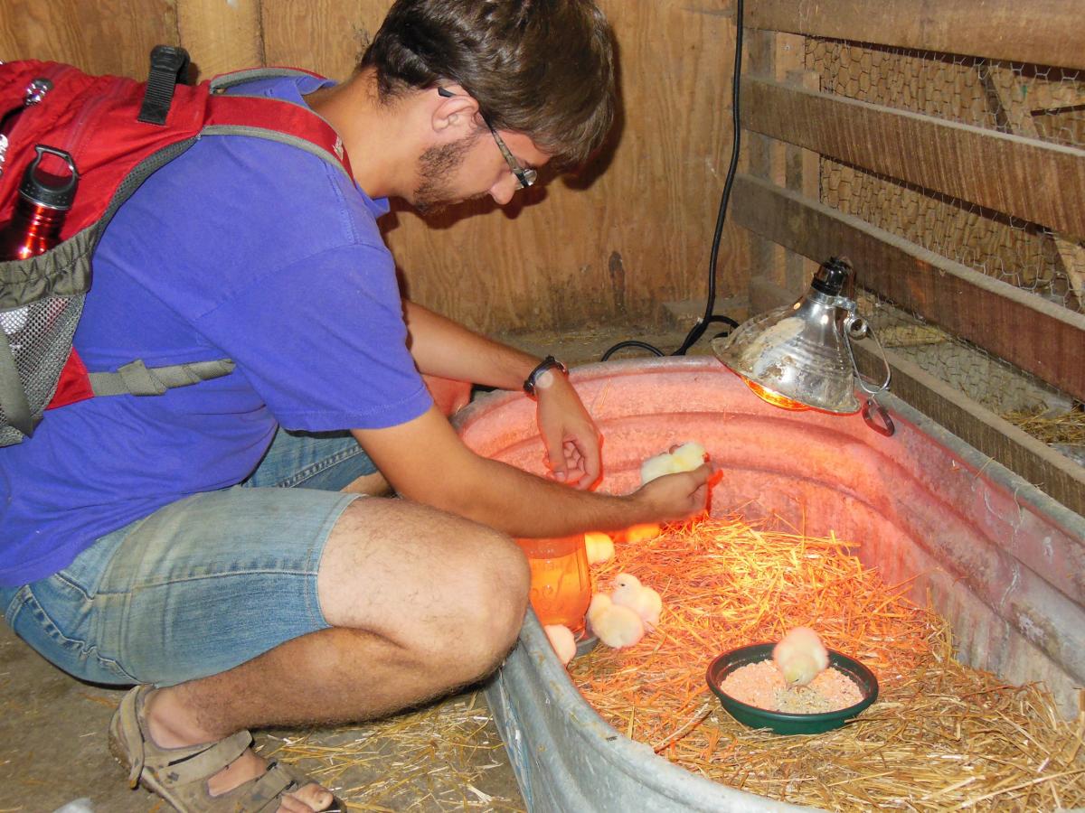 The final week of the summer intensive has arrived! We were grateful for a quarter inch of rain on the last day of July, Tuesday, a day that also saw the arrival of 15 day-old chicks destined for our chicken tractor. We installed them under a heat lamp in the barn for their first several weeks.