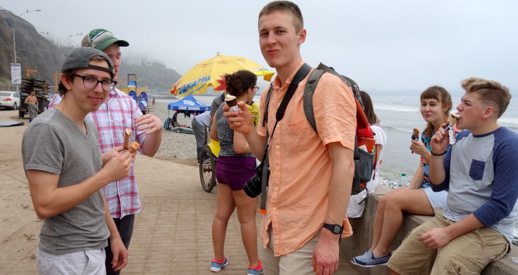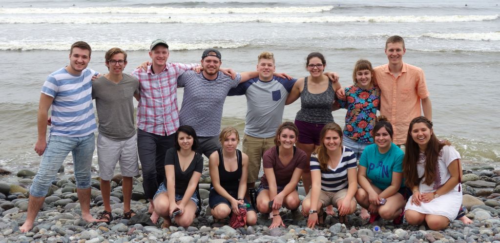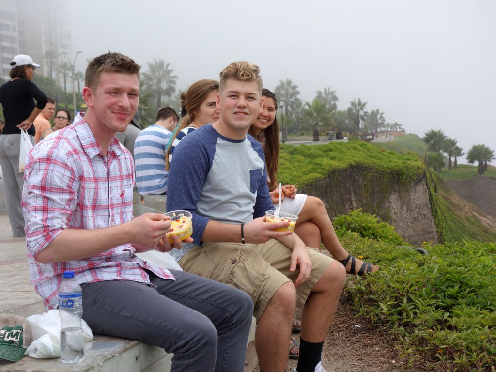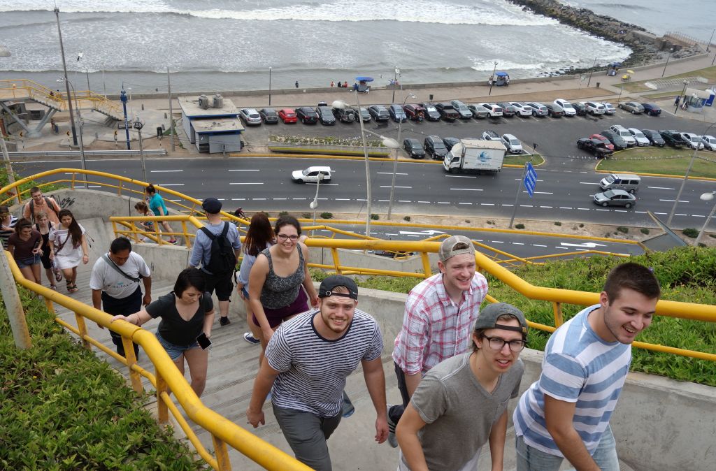 After sleeping in from their late night arrival, Doug picked up the students for a 15-minute walk to Casa Goshen, the SST house where Maria and Doug live and have their office. After some introductions and a reflection on SST as a pilgrimage, we took a 20-minute walk along a nearby cliff-top park that overlooks the ocean. Students got to try a picnic lunch with causa, a popular Peruvian dish made from a Peruvian staple, potatoes. While in Peru, everyone wanted to touch the Pacific Ocean (something that Goshen doesn’t have much of), so we walked down a long series of stairs to the waterfront, where the students also enjoyed some ice cream.