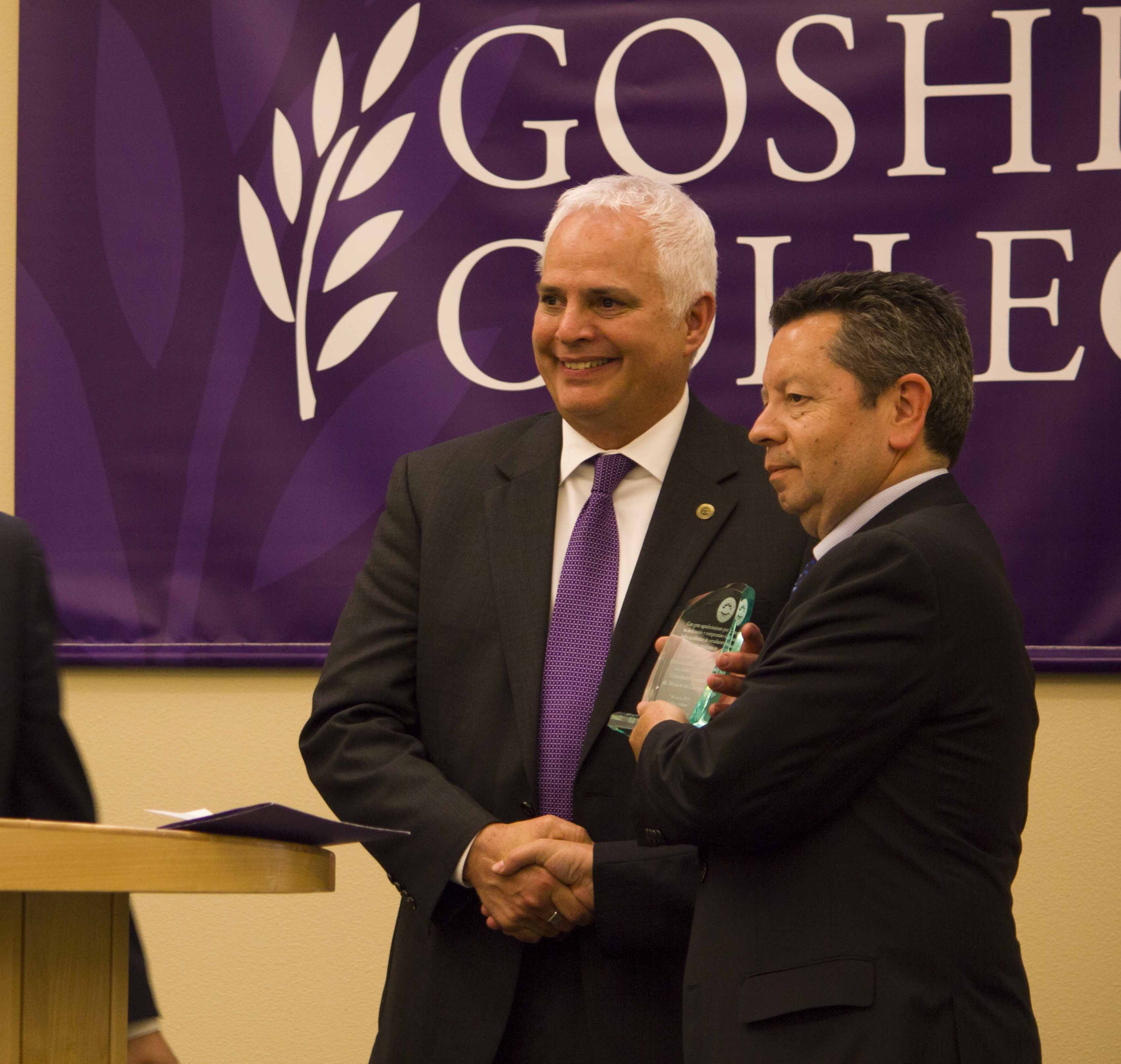 Goshen College President Jim Brenneman presents a plaque to Arturo Maldonado Tapia, cultural affairs director for the Mexican Consulate in Chicago, at a 2015 celebration.