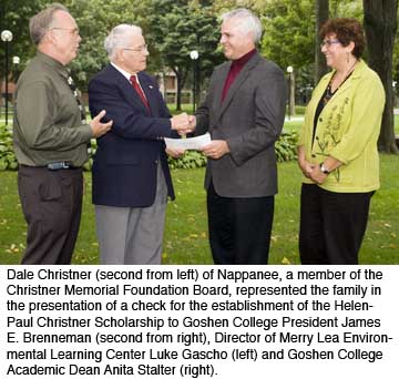 The Christner Memorial Foundation has recently granted funds to establish the Helen-Paul Christner Scholarship to be given to a student enrolled in the Master of Arts in Environmental Education program at Goshen College. The scholarship is established for the environmental and ecological protection and preservation of the earth with special emphasis on the flora and fauna of Northern Indiana. The recipient is to be an outstanding Hoosier student with a strong commitment to environmental education for the state of Indiana. Helen Todd Christner was an elementary school teacher in northern Indiana throughout her career. She began her teaching in a one-room schoolhouse after completing a teacher-training program. She later completed a degree in education at Goshen College in 1949.