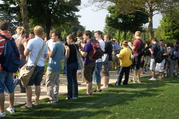 Afterward, and in what has become an annual tradition since 2000, the Goshen College “Tunnel of Welcome” or “Applause Avenue” formed outside the convocation. Faculty, staff and students walked past their peers to sustained applause, and then joined and extended the lines for seniors, juniors, sophomores and first-year students to pass by. The applause of welcome continued until Sauder Concert Hall was empty and the line stretched west nearly to the railroad tracks and toward the center of campus.