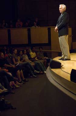 “Did you know that almost everything you learn in the first year will be outdated by the time you are juniors?” he told more than 800 people in the Music Center’s Sauder Concert Hall. “We live in such a rapidly changing world that it’s almost impossible to keep up with the data flow. Did you know, for example, that the number of text messages sent and received each day exceeds the total population of the planet?”