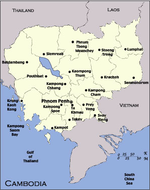 Cambodia is located between Vietnam, Laos and Thailand, and is slightly smaller than Oklahoma. The country’s government is now a monarchy with a parliamentary system, but was under French control until 1953. The French influence can still be seen in architecture and bakeries, but fewer people speak French anymore.