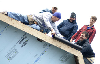 (From left to right) Goshen College President Jim Brenneman, Vice President for Student Life Bill Born, Eddie Mayorga, senior Brian O'Leary and junior Jackson Beck help assemble the roof of the Mayorgas' new Habitat house on Feb. 28. Photo by Alysha Landis/Goshen College Public Relations.