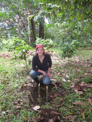 We rode a chicken bus for about 30 minutes along a bumpy road to the community of La Grecia just outside San Ramon, Matagalpa to visit Mary. Mary is working with Vicente Padilla (not the baseball player) on his organic farm. You may remember Vicente’s farm from an earlier visit by the entire group in May. She has experienced a wide variety of tasks and every day does something different. She is learning about coffee, bananas, and other crops. She eats a lot of fresh bananas and other foods from the farm. She also has helped fix a lean-to, milked the family cow, weeded the garden, cleaned out the earthworm compost, cleared walking paths, watched her host sister’s folk dances, helped build a small cement pool to help in sorting coffee beans, and she still finds time to nap every afternoon! Mary has embraced working with the land and alongside her host father and brothers. Every day has a new adventure and story to tell.