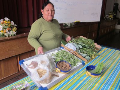 After breaking for coffee, Alicia Taipe Tello told us her life story, beginning with her childhood in the Andean city of Huancayo. Her mother was known for her knowledge of medicinal herbs and Alicia explained how a dozen different plants are used to soothe the stomach, calm the nerves or cure a sore throat. She prepared a variety of teas and the students enjoyed the chance to sample each one.
