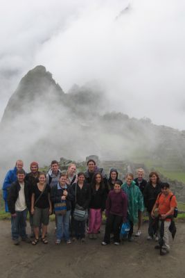 The day of our visit was foggy as well as rainy—but not so much that it stopped SSTers from climbing the steep mountain in the backdrop of Machu Picchu postcards (the same mountain which was obscured by fog during most of our visit and thus not in many of our photos), Wayna Picchu.