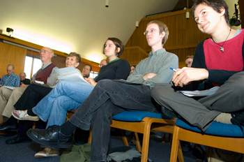 Forty years later, those three leaders along with others who also resisted the draft or who supported draft resisters gathered on Nov. 13 and 14 at Goshen College for a reunion and an intergenerational conference: “Resistance: Taking a stand against war, 1960s to today.” More than 50 people attended the conference – a third of which were students – planned by current Goshen College seniors Daniel Foxvog of Tiskilwa, Ill., Hannah D. Miller of Scottdale, Pa., and Annali Smucker of Akron, Pa.; Professor Emeritus of Religion J.R. Burkholder; and faculty members Joe Liechty, associate professor of peace, justice and conflict studies, and Tamara Shantz, assistant campus minister.