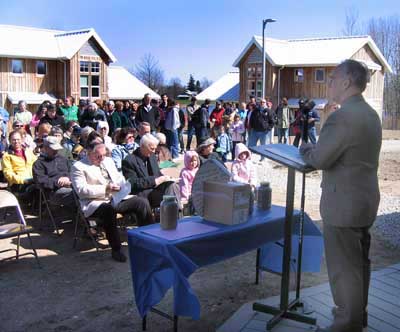 More than 150 students, staff, board members, faculty, contractors, design team members and friends of Merry Lea attended the outdoor dedication of Rieth Village. Above them, a 10-kilowatt wind generator spun in a brisk breeze, and solar hot water panels on the cottage roofs absorbed the spring sunshine.