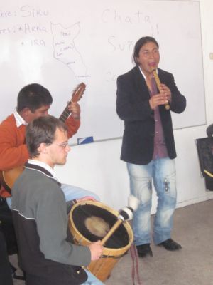 Our guests played a variety of pieces for us, including a song featuring Aymara lyrics, the native language spoken around Lake Titicaca and the highland areas of Bolivia. Then someone asked about huaynos, a popular genre in this region that is rooted in traditional Andean folk tunes. Mauro admitted his distaste for modern huaynos and offered to play us an original huayno instead. Hearing the tune, our program assistant, Alicia, stepped into the circle and began inviting people to dance — she couldn’t help moving her feet to the rhythm. So we did too.