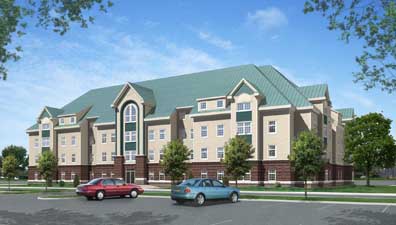 President James E. Brenneman said today that the new campus building would connect to an existing four-story apartment building, which has 64 single rooms in 16 apartments. The new building will add 93 single rooms in 25 apartments as well as a new main entrance from the east parking lot, an elevator providing ADA-accessibility to all units, and a two-story townhouse-style unit for an apartment manager.