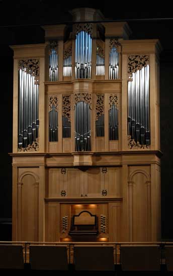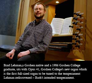 Opus 41 was designed by Taylor and Boody Organbuilders of Staunton, Va., and is based upon 18th century North German organbuilding principles. It features more than 1,600 pipes, and a case of carved solid white oak. The key and stop action are mechanical (tracker), with two manuals and a flat pedalboard. The temperament is Johann Sebastian Bach’s preferred system, as specified on the title page of the “Well-Tempered Clavier,” 1722. This tuning method was re-discovered by Lehman, a 1986 Goshen College graduate, in 2004 and published in the February and May 2005 issues of “Early Music” magazine. Opus 41 is the first organ since the 18th century to employ Bach’s previously lost tuning in its construction. The organ was dedicated in a series of concerts and events May 1 through May 8, 2005.