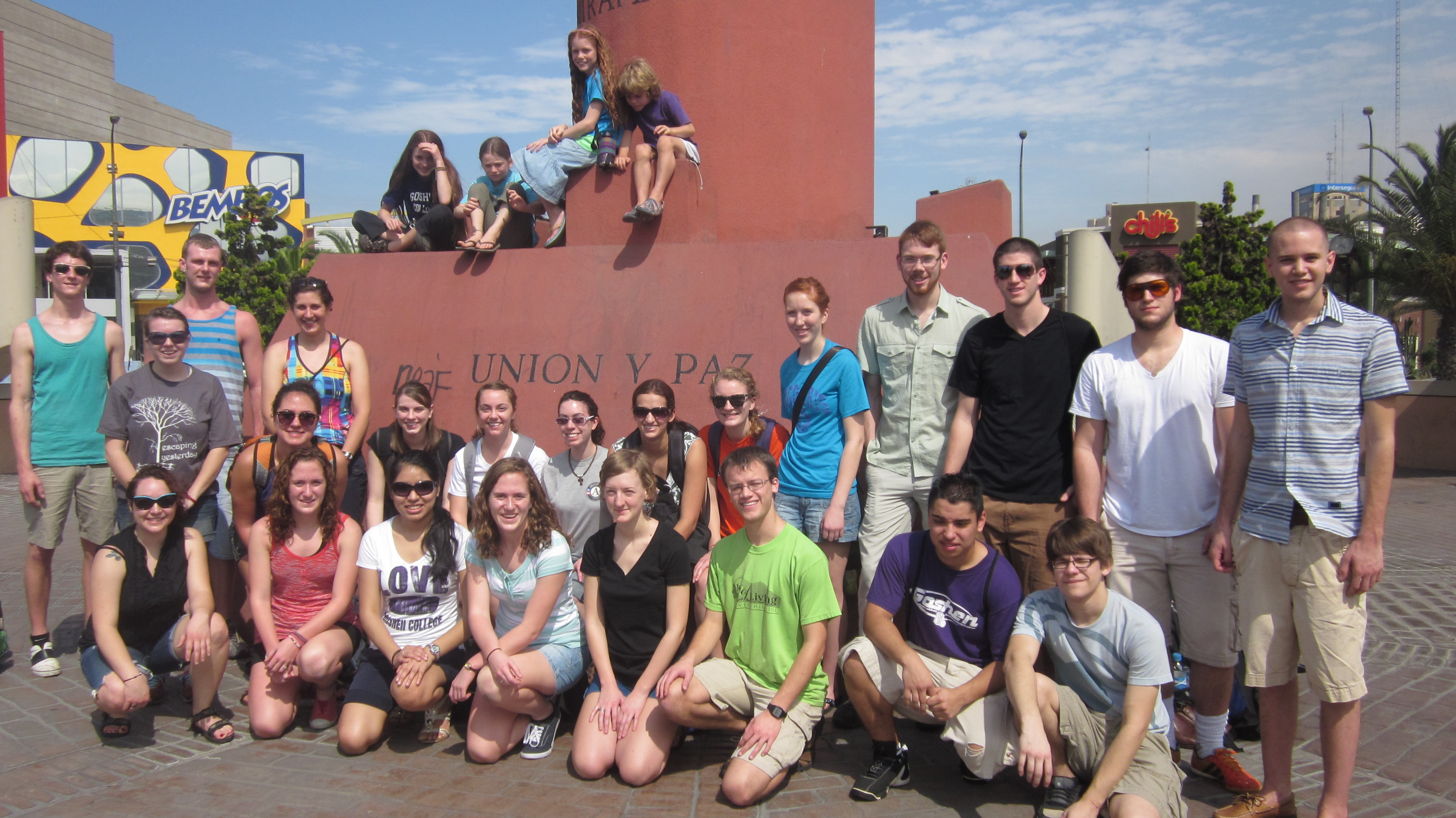 Blue skies, white clouds, expectant smiles. We began the day with a walk from the hostel at Home Peru to the director’s home, Casa Goshen. Along the way we passed a pre-inca archaeological site — Huaca Pucllana — a cluster of decidedly post-inca institutions — McDonalds, TGI Fridays, Starbucks — and a statue in the middle of Gutierrez Circle that proclaims “Union and Peace”.