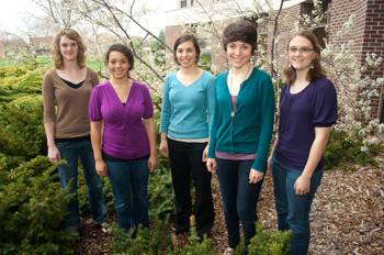 GOSHEN, Ind. – The Goshen College student-led worship team, Parables, will use music, personal stories and original drama to worship in congregations and other venues over the next year. The program for 2011-12 follows the theme of “Whole and Broken.” Parables is directed by Professor of Music Debra Brubaker and includes Eliza Graber (Plain City, Ohio), Emily Grimes (Goshen), Stephanie Hollenberg (Elkhart, Ind.), Brook Hostetter (Harrisonburg, Va.) and Lauren Treiber (Grand Rapids, Mich.).