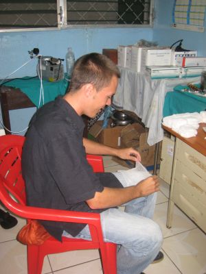 Caleb is working with several doctors at the local Centro de Salud. He has spent time with the Internal Medicine doctor, Pediatrician, Emergency room doctor, and the Obstetrics doctor. The physicians explain the different diagnosis and how to treat them effectively. He also got to spend a day walking around the community treating the water to prevent Malaria and Dengue. The physicians have also shared their struggles of working at a health center with limited supplies, inadequate facilities at times, and the difficulties of transporting patients to larger health centers and hospitals. There is one unpaved road out of Pearl Lagoon but it is a 12 hour journey to Managua. Most patients that need more specialized treatment are taken by panga to Bluefields for treatment at their own cost. The government provides a small amount of money for the transportation to Bluefields, so women and children under the age of 6 are given priority. As we returned to Bluefields on our way home, we experienced someone being transferred to Bluefields at their own cost in the public panga. Caleb has also been taught how to fold gauze and the next morning when we visited him he was busy folding gauze. All gauze is hand-folded and then sterilized, since pre-packaged gauze is not available.