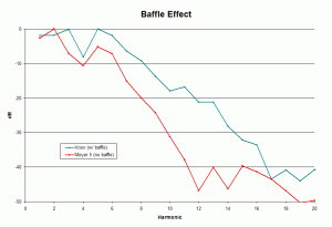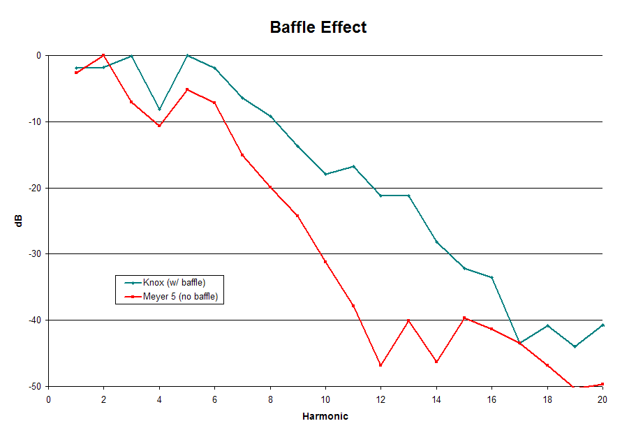 Next we should consider the effect of the baffle. For this comparison we shall examine the harmonic spectra of the Knox Custom (which has a baffle) as well as the Meyer 5M (which has an open, round chamber with no baffle).