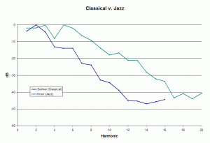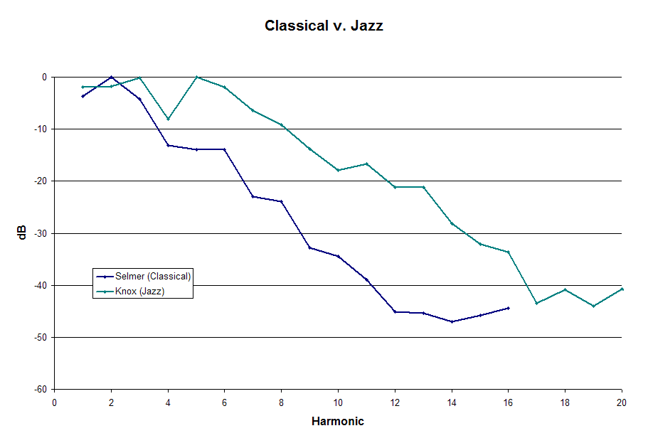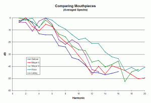 There are several important observations to be noted here. The first is that when comparing the harmonic spectra of a classical mouthpiece (such as the Selmer C*) and a jazz mouthpiece (such as the Knox Custom), there is a noticeable discrepancy between the relative loudness of all harmonics beyond the 4th.