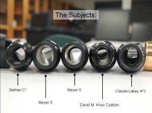 A Selmer model AS110 alto saxophone was used for this experiment, in conjunction with a Vandoren 3 1/2 Java reed. Five different mouthpieces were tested (see above): a Selmer C*, a Meyer 5M, a Meyer 6M, a David M. Knox Custom, and a Claude Lakey 4*3. Samples were recorded using an Audio-technica AT3031 microphone and using Cool Edit Pro 2.1 software. Samples were recorded as a single note (A#4) starting quietly and slowly growing louder. (Listen to the actual recorded samples used here: [links to: Selmer example, Meyer 5 example, Meyer 6 example, Knox example, and Lakey example.wav]) The frequency analysis feature of Cool Edit Pro was then used to obtain a harmonic spectrum for each of three dynamic levels for each sample. (Examples of raw data collected from a single dynamic can be seen here [links to: selmer spectrum and knox spectrum.jpg]) The three sets of data collected for each mouthpiece were then averaged to give on general characteristic harmonic spectrum for each mouthpiece. It was these averaged harmonic spectra that were then analyzed comparatively.