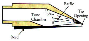 Another method of changing the sound produced in the tone chamber is the introduction of the baffle. As can be seen in the diagram below, the baffle is generally wedge-shaped, and can be a variety of sizes.