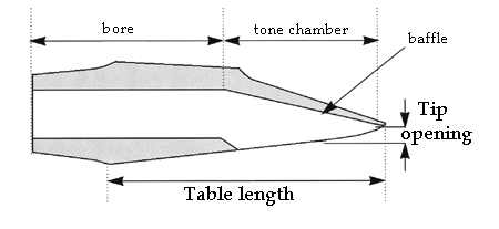 The two main mouthpiece features to note here are the facing and the chamber characteristics. Let us first consider the facing. The facing essentially consists of the table length and the tip opening.