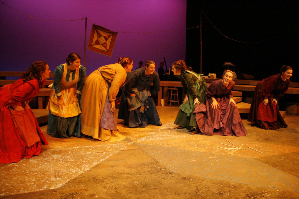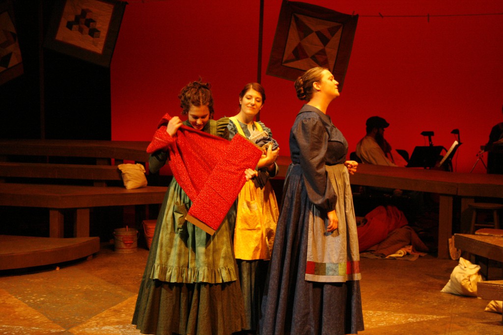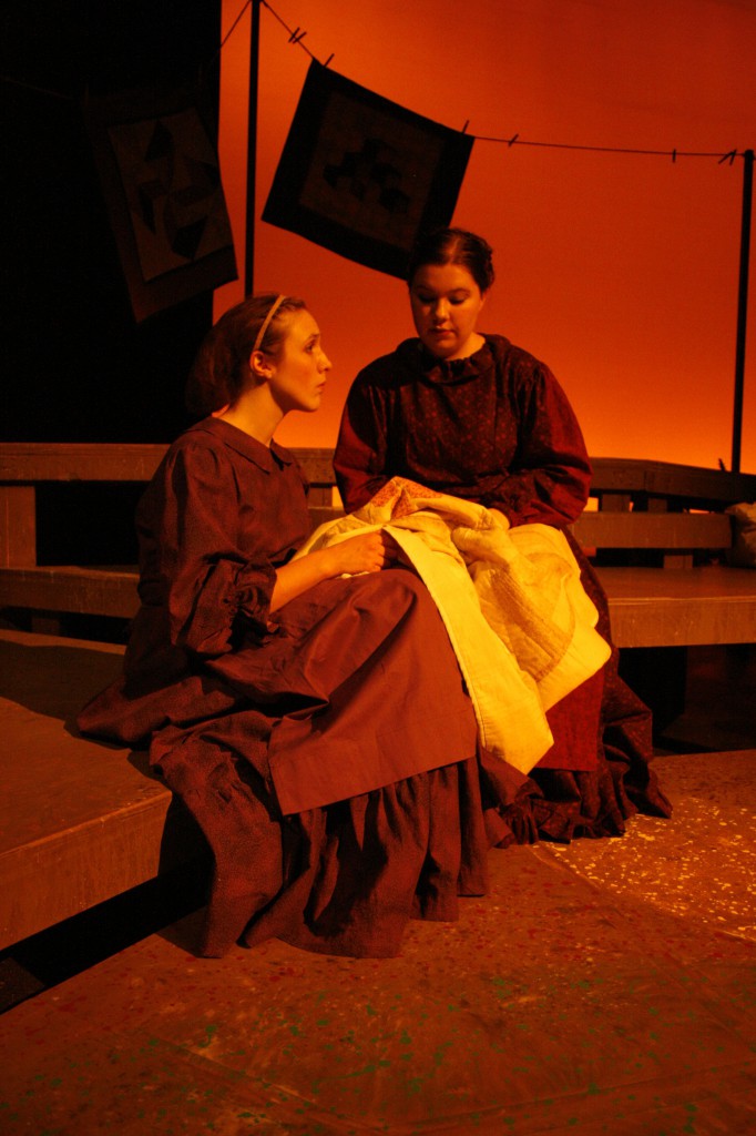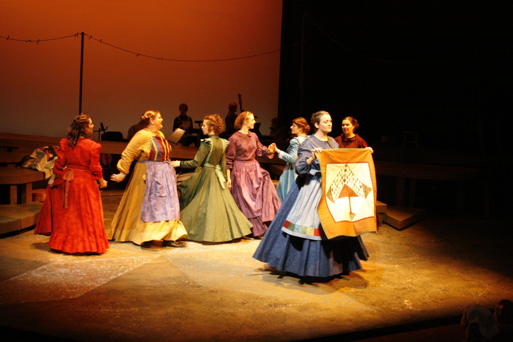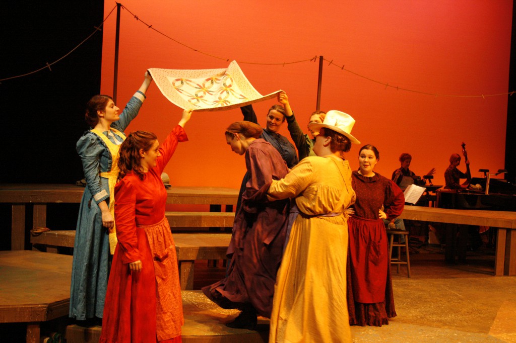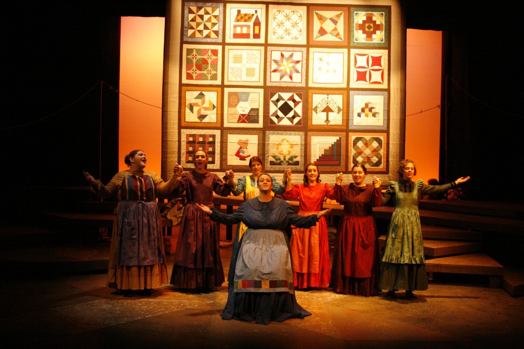 Though it was a fast and furious process, the month of preparing and performing was also full of new experiences. “I introduced the making of quilt patches so that the cast and crew could get their hands and fingers around what it feels like to put together fabric and make a quilt,” said Brubaker, a quilter herself. “There are many references to needles, stitches, fabric, etc., in the musical and I wanted the women to ‘own’ these ideas and concepts.”