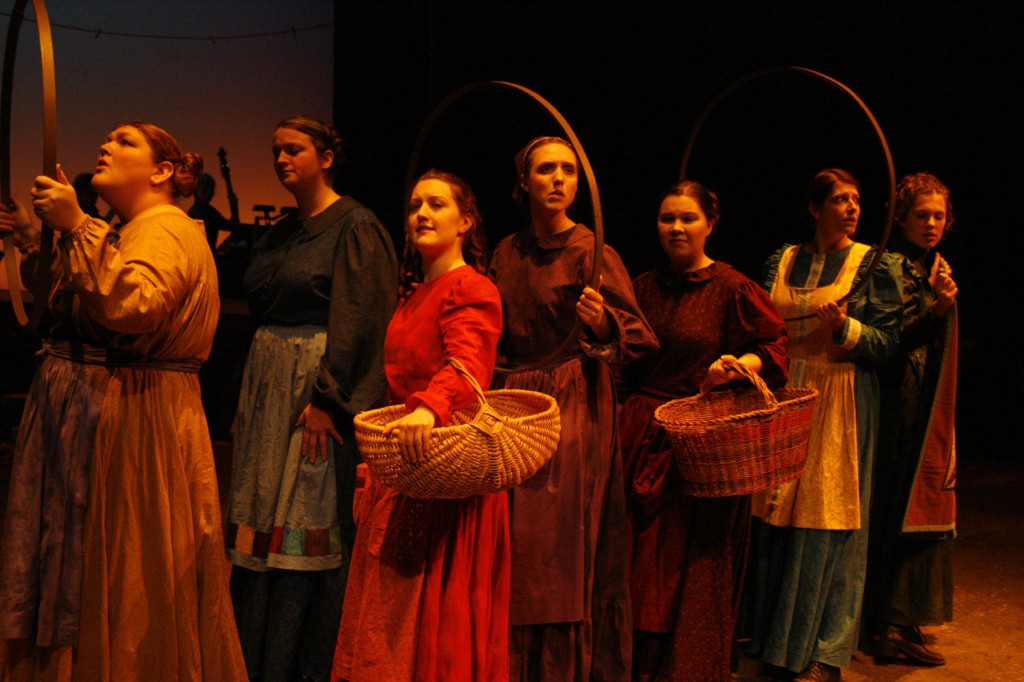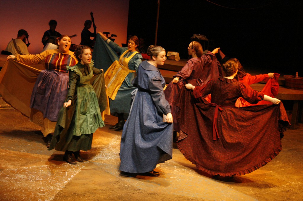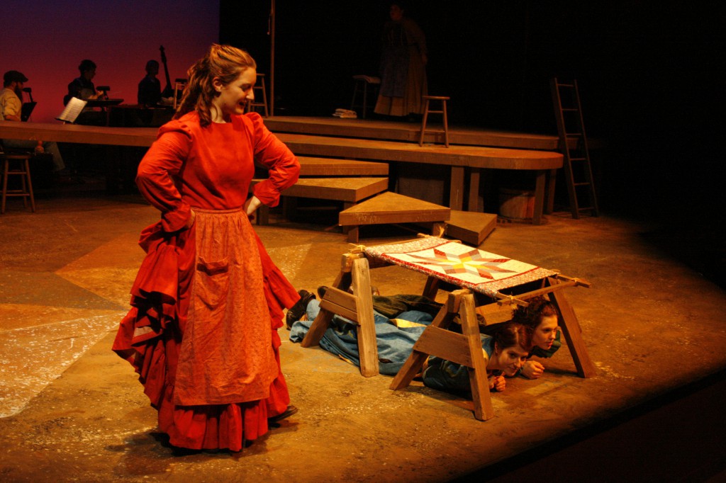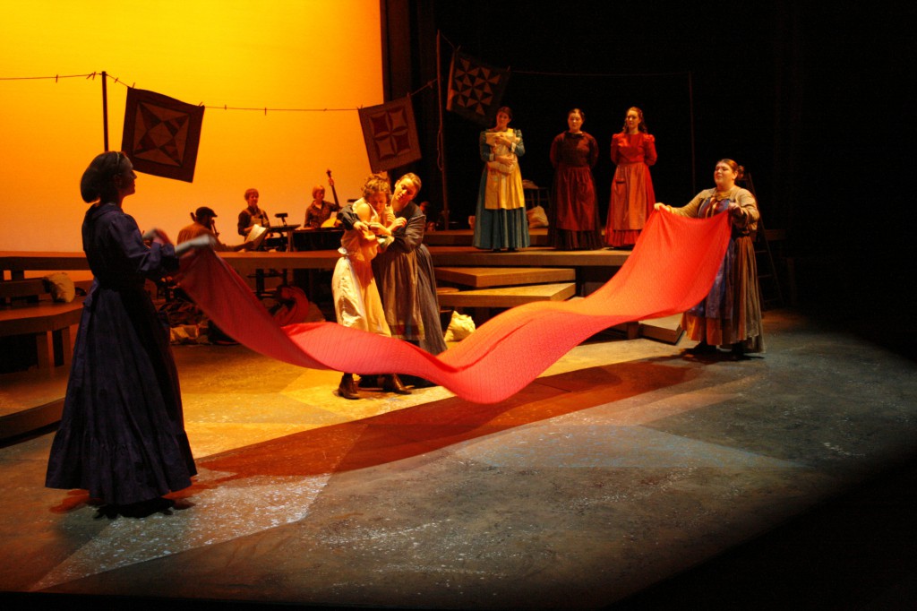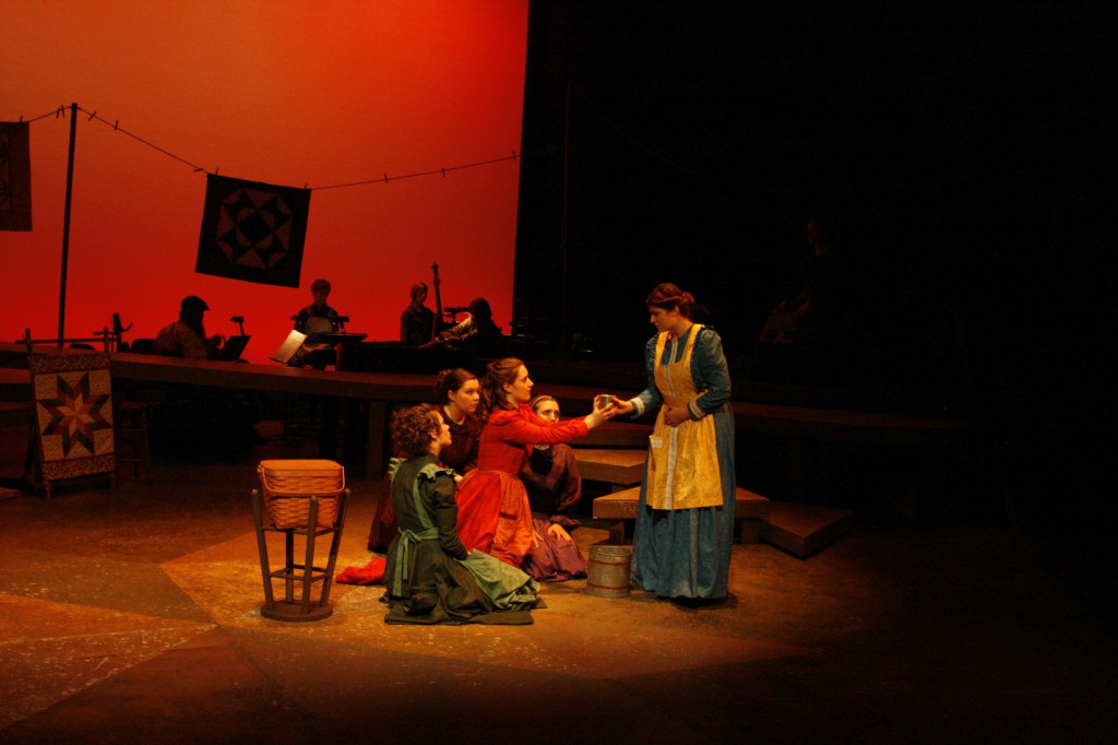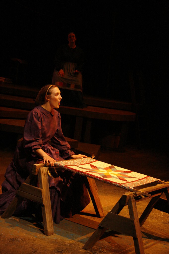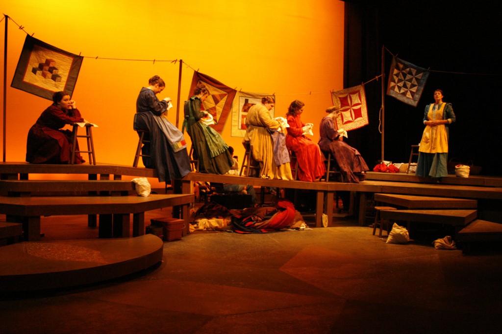 Though it was a fast and furious process, the month of preparing and performing was also full of new experiences. “I introduced the making of quilt patches so that the cast and crew could get their hands and fingers around what it feels like to put together fabric and make a quilt,” said Brubaker, a quilter herself. “There are many references to needles, stitches, fabric, etc., in the musical and I wanted the women to ‘own’ these ideas and concepts.”