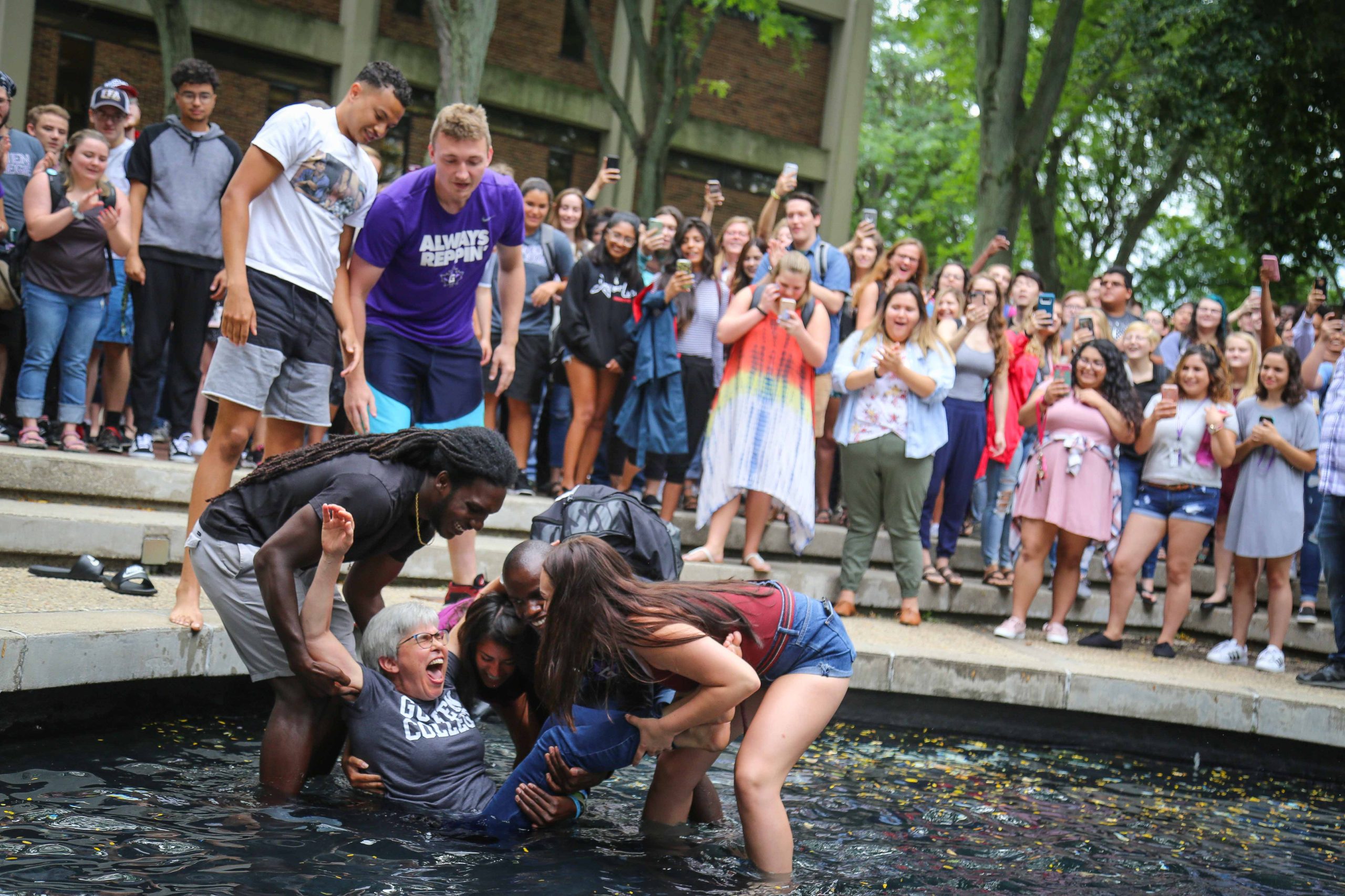 On Wednesday, Aug. 29, during a presidential convocation to open the new school year, new and returning students from 28 countries and 37 states were welcomed back to campus with the annual applause tunnel, followed by the tradition of dunking the new president.