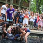 As the tunnel wrapped around Schrock Plaza, several students carried President Stoltzfus through the crowd and dunked her in the fountain, a tradition for new presidents that goes back to 1971 when students dunked President J. Lawrence Burkholder during his inauguration celebration activities, and has continued with six presidents since.